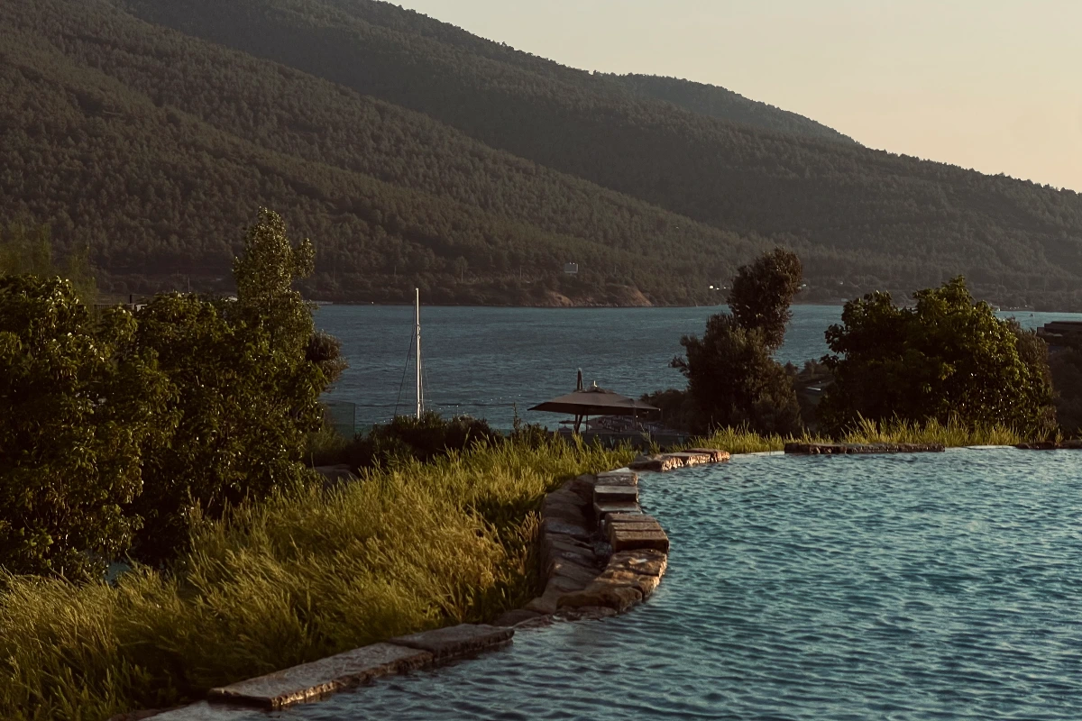 An architectural complex on the coast in Bodrum: panoramic glass facades, rough stones,