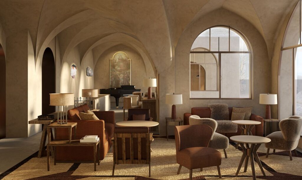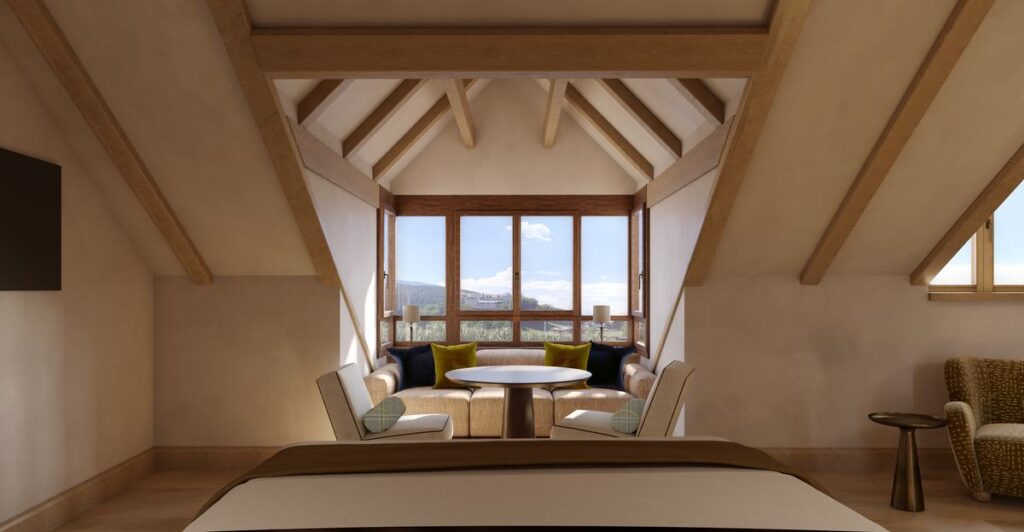 Structural restoration was led by Null17, while Droulers Architecture—working with designer Marta Ferri—reimagined the interiors. The brief was restraint: introduce contemporary comfort without diluting monastic austerity. Materials remain local, within a fifty-kilometer radius. Stone and timber dominate. The result balances cloistered severity with measured warmth, allowing original beams and modern interventions to coexist without hierarchy.