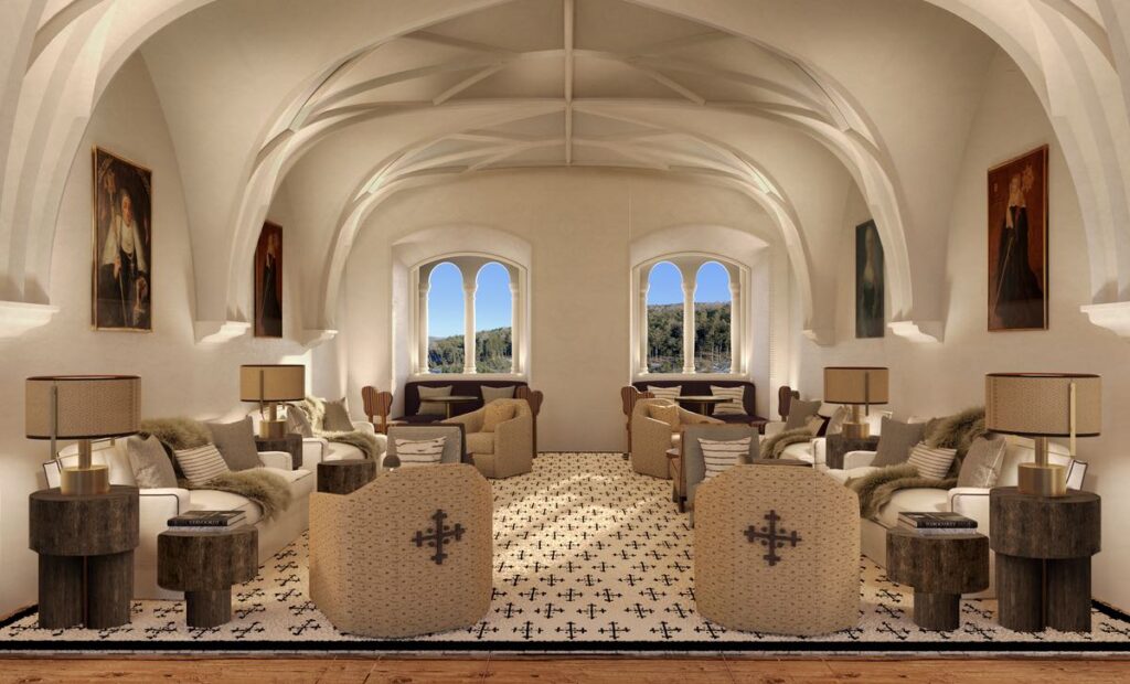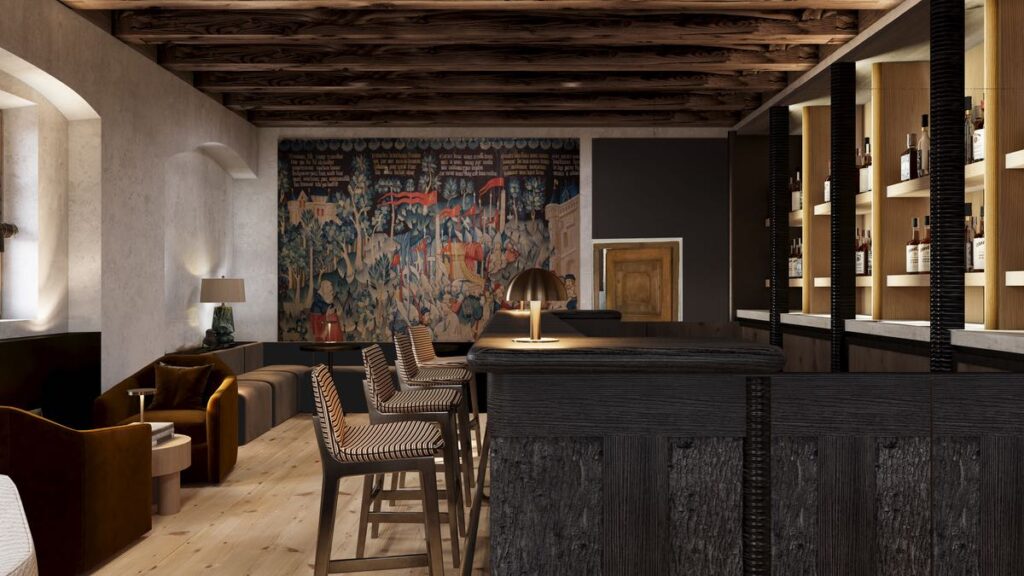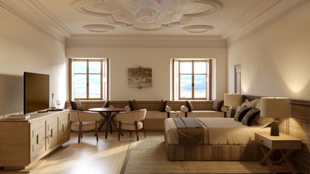 The building’s latest transformation respects this stratified past. Among South Tyrol’s most significant monuments, Castel Badia required continuous oversight by the Superintendency for Cultural Heritage. Medieval curtain walls, arrow slits, and bastions were preserved. Windows were reconstructed using historic techniques. In the crypt (c. 1030), artisans recovered eleventh-century fresco fragments millimeter by millimeter, revealing figures and ornamental motifs long concealed beneath later layers.