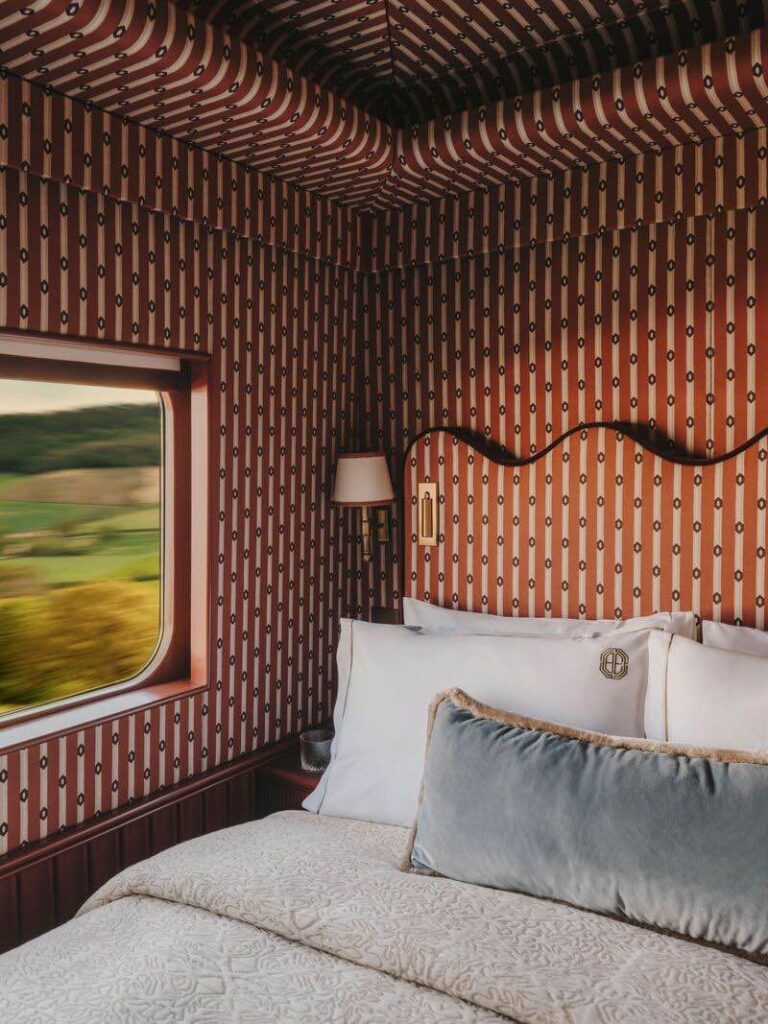 Hall’s process began with pencil and paper—hand-drawn designs that Rubelli’s artisans translated into woven textiles. One suite features his “Diamond Stripe” pattern, reimagined in a bold red that would feel at home in either a stately library or a punk rock album cover. Other cabins are wrapped in custom fabrics depicting the journey itself: Welsh dragons, Somerset bridges, Hampshire castles, and seagulls wheeling over coastal scenes. The walls function almost as illustrated maps, though rendered in jacquard weave rather than ink.